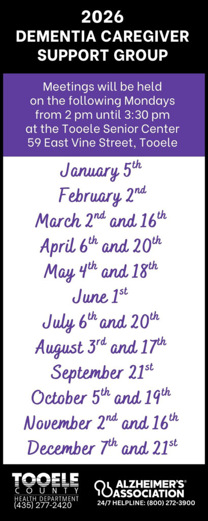 Currently, in-person meetings are being held to provide emotional, educational, and social support to those who are caring for a loved one who has a type of dementia. Please see the announcement below for meeting details. Call Tooele County Aging Services at 435-277-2420 or email sarah.obray@tooeleco.gov