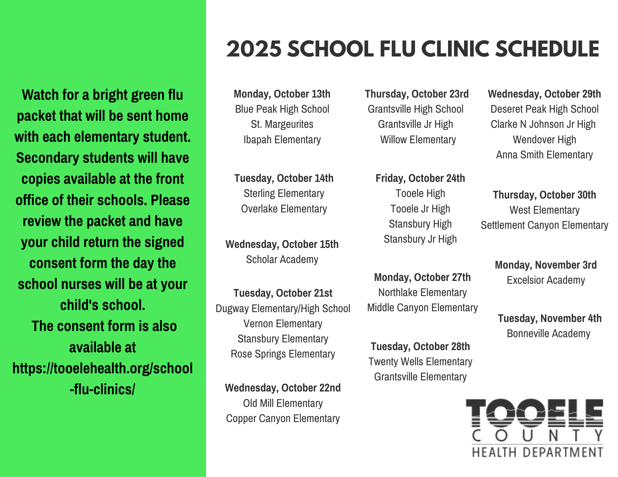 Listed below is the 2025 School Flu Clinic Schedule. Contact our office at 435-277-2310 or 277-2311 if you have questions.